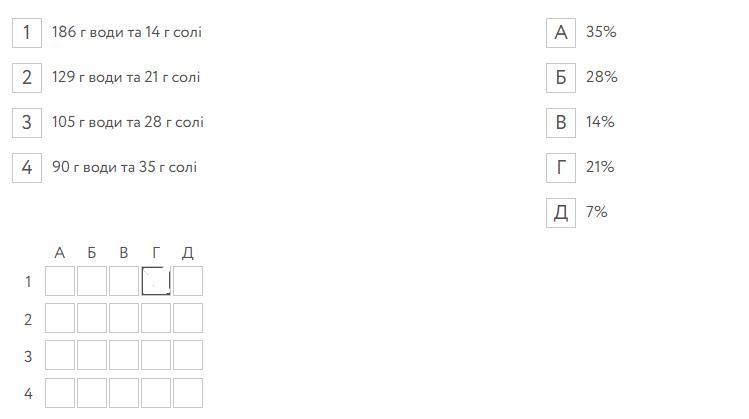 Установіть відповідність між масами компонентів розчинів (1-4) та масовими частками розчиненої речовини в утворених розчинах (А-Д).