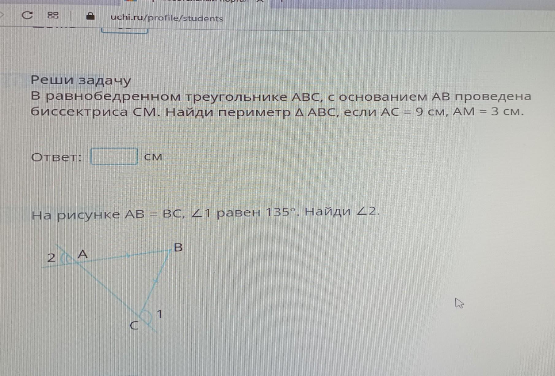 2) так как угол АСВ смежный с углом 1 (их сумма равна 180 градусов), то угол АСВ=180-135=45