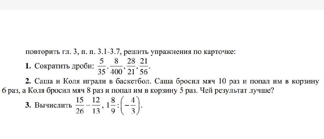 1. Сократить дроби: 5 8 28 21 , , , . 35 400 21 56 2. Саша и Коля играли в баскетбол. Саша бросил мяч 10 раз и попал им в корзину 6 раз, а Коля бросил мяч 8 раз и попал им в корзину 5 раз. Чей результат лучше? 3. Вычислить по карточку