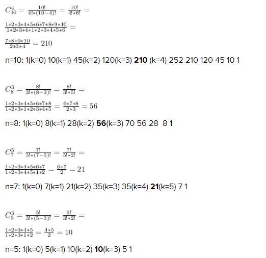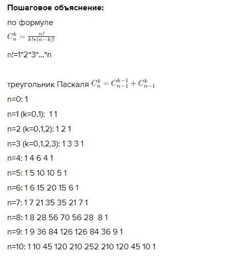 n=10: 1(k=0) 10(k=1) 45(k=2) 120(k=3) 210 (k=4) 252 210 120 45 10 1