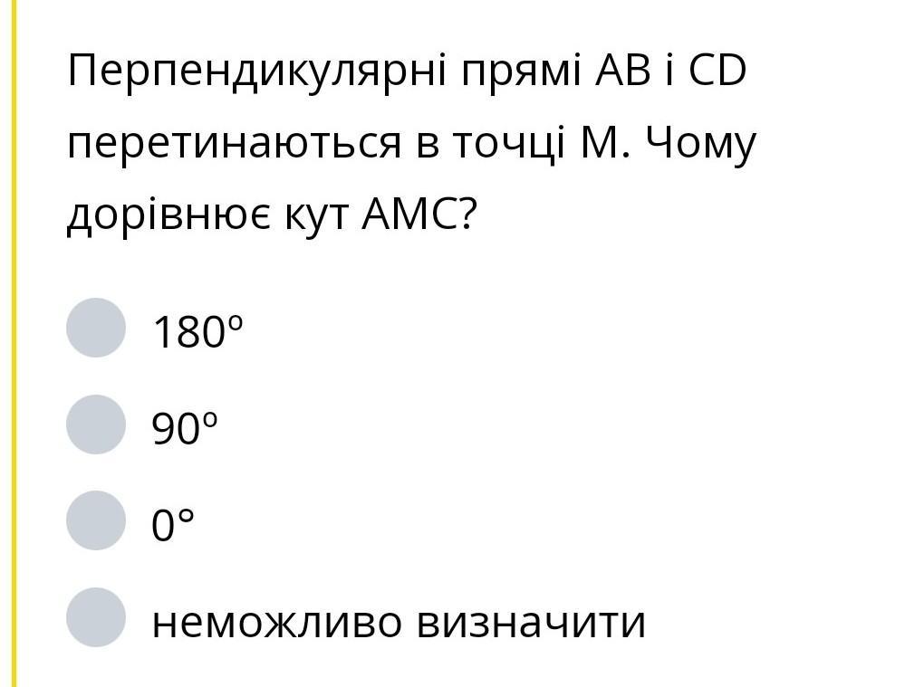 Перпендикулярні прямі АВ і СD перетинаються в точці М. Чому дорівнює кут АМС? 180° 90° 0° немОЖЛИВО ВИЗначИТИ