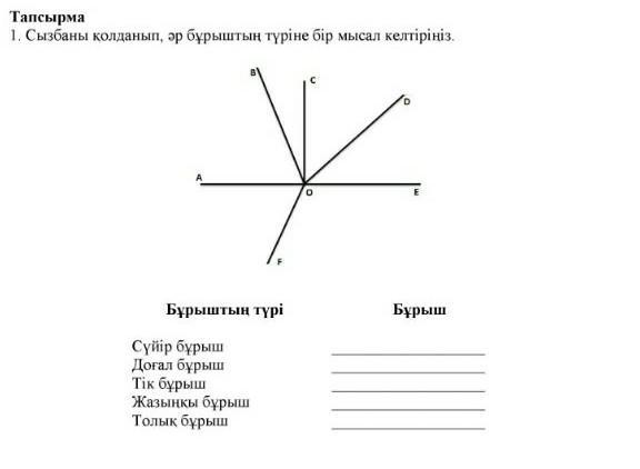 Тапсырма 1. Сызбаны қолданып, әр бұрыштың түріне бір мысал келтіріңіз. И о Бұрыш Бұрыштың түрі Сүйір бұрыш Доғал бұрыш Тік бұрыш Жазыңқы бұрыш Толық бұрыш
