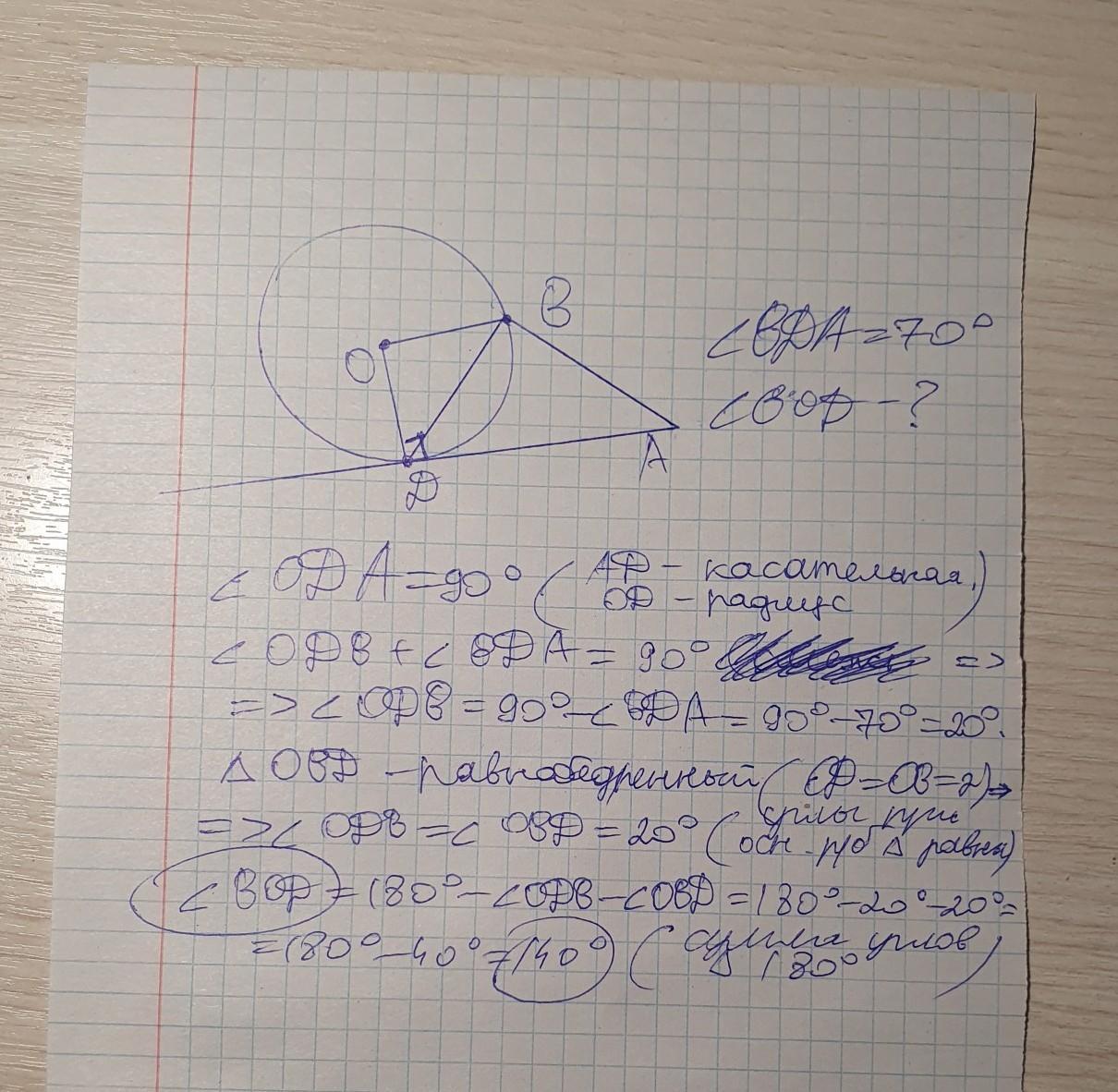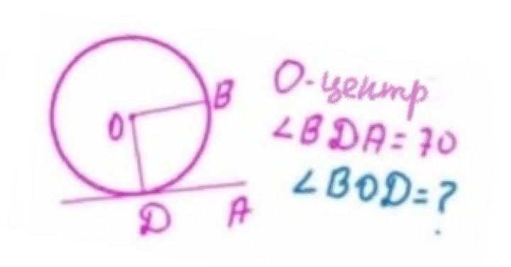 => уг. ODB = уг. ODA - уг. BDA = 90° - 70° = 20°