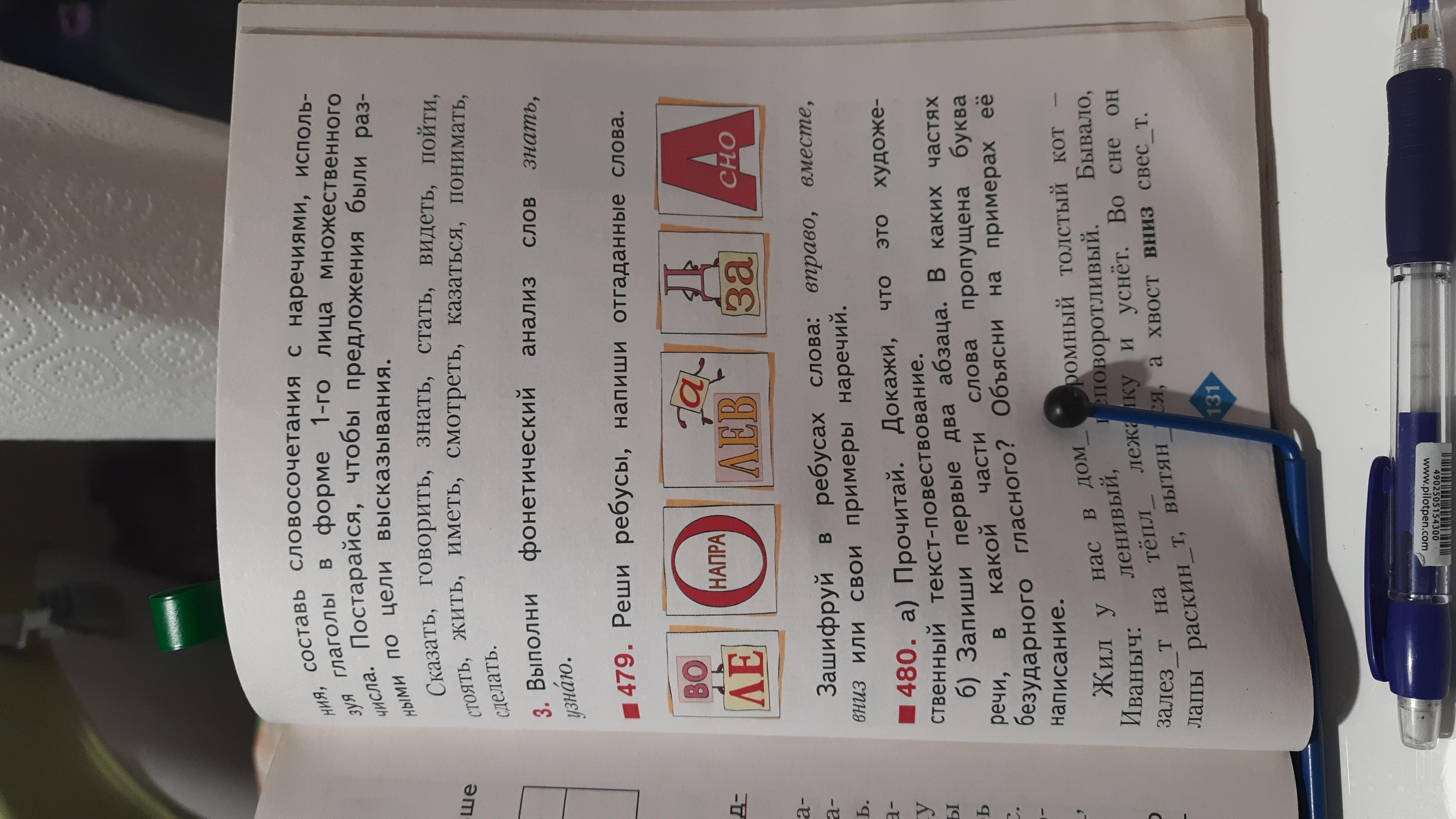Упр. 479. Реши ребусы, напиши отгаданные слова. Зашифруй в ребусах слова: вправо, вместе, вниз или свои примеры наречий.