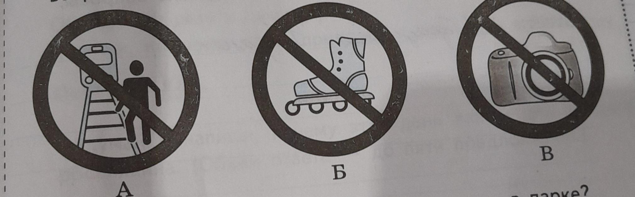 Объяснение:а- нельзя ходить по рельсам, может быть столкновение с поездом. Б-катание на роликах запрещено. В-фотографировать запрещено.