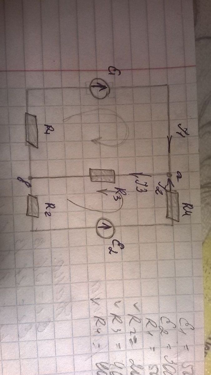 В электрической цепи определить токи во всех ветвях ,если Е1=500 В, Е2=300 В, R1=5000 Ом, R2=2000 Ом R3=4000 Ом R4=4000 Ом.