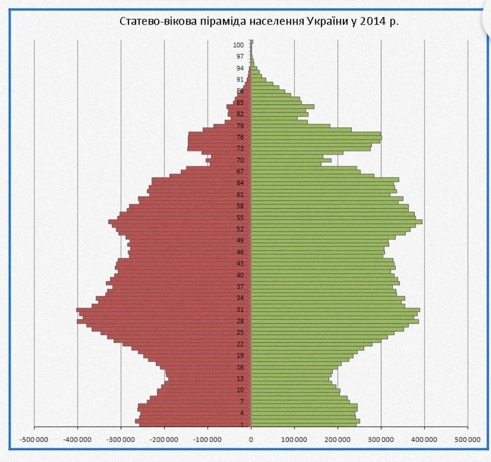 Уважно ознайомся із будовою статево-вікової піраміди України. Порівняй чисельність населення України віком 20-25 років із чисельністю населення віку їх батьків. До яких наслідків призводять такі зміни?