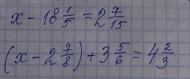 \displaystyle 1)x-18\frac{1}{5}=2\frac{7}{15}\\ \\x-\frac{91}{5}=\frac{37}{15}\\ \\x=\frac{37}{15}+\frac{91}{5}\\ \\x=\frac{62}{3}=20\frac{2}{3}\\ \\2)(x-2\frac{7}{8})+3\frac{5}{6}=4\frac{2}{3}\\ \\(x-\frac{23}{8})+\frac{23}{6}=\frac{14}{3}\\ \\x-\frac{23}{8}+\frac{23}{6}=\frac{14}{3}\\ \\x+\frac{23}{24}=\frac{14}{3}\\ \\x=\frac{14}{3}-\frac{23}{24}\\ \\x=\frac{89}{24}=3\frac{17}{24}