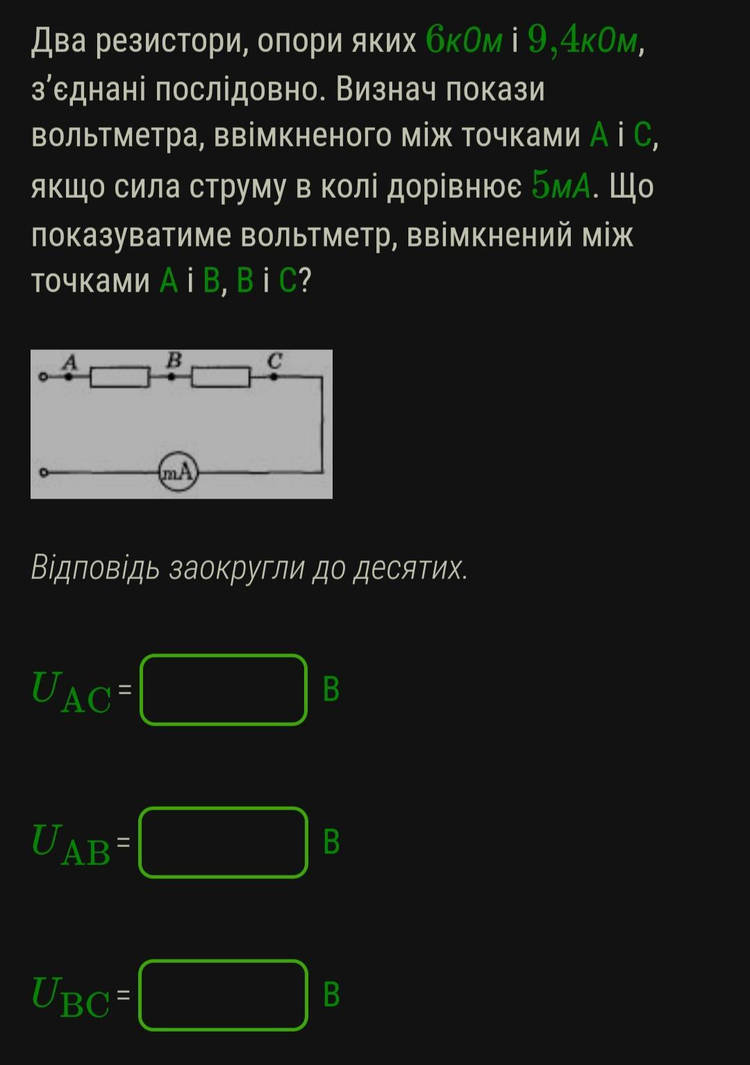 2. Два резистори, опори яких 6кОм і 9,4кОм, з’єднані послідовно. Визнач покази вольтметра, ввімкненого між точками А і С, якщо сила струму в колі дорівнює 5мА. Що показуватиме вольтметр, ввімкнений між точками А і В, В і С?