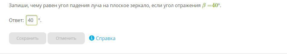 Согласно закону отражения угол падения ∠ α равен углу отражения ∠ β: ∠ α = ∠ β. Так как ∠ α = 40, то и ∠ β = 40. ∠ α + ∠ β = 40 + 40 = 80.