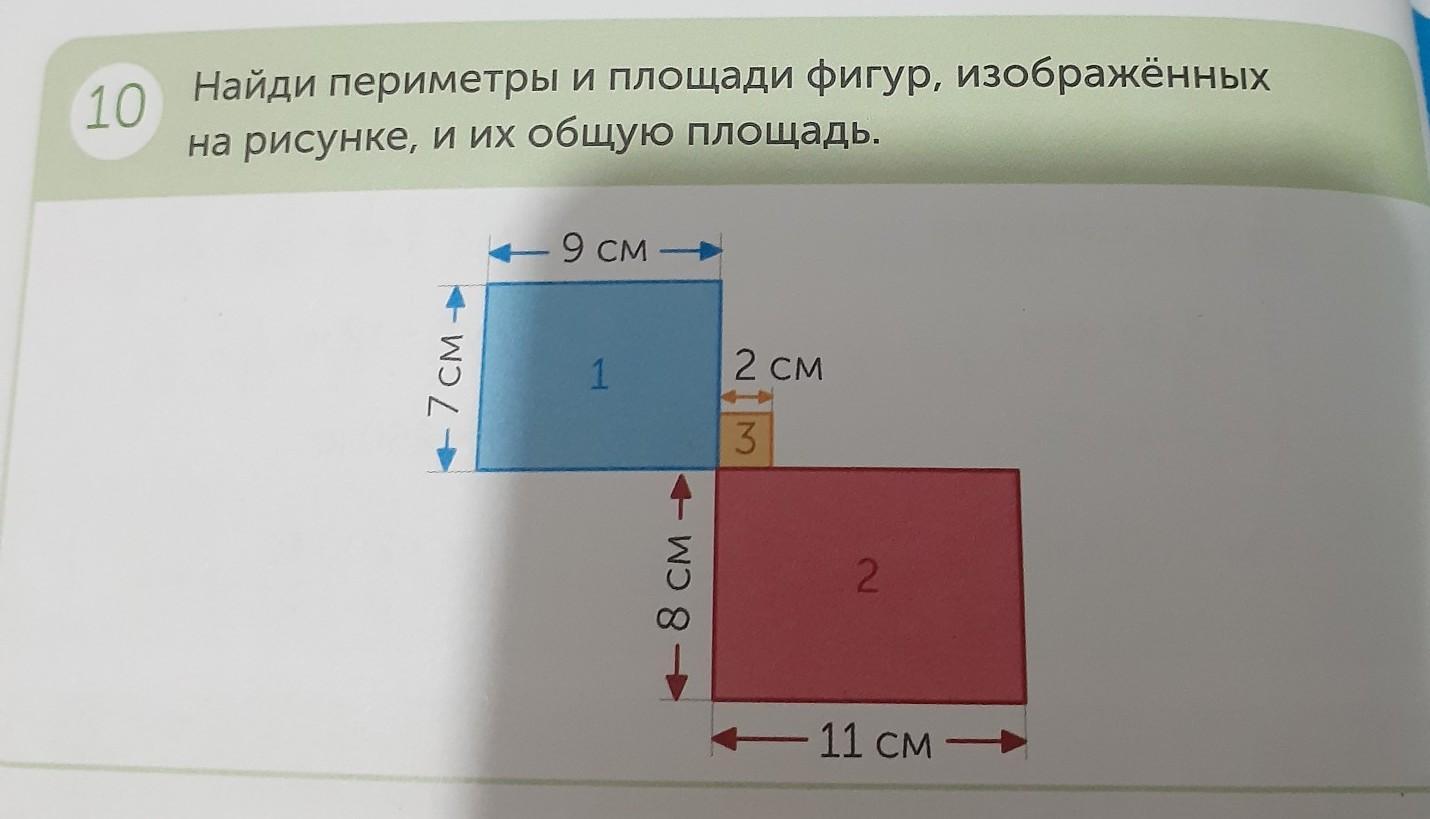 пжжж 10.Найди периметры и площади фигур, изображенных на рисунке, и их общую площадь