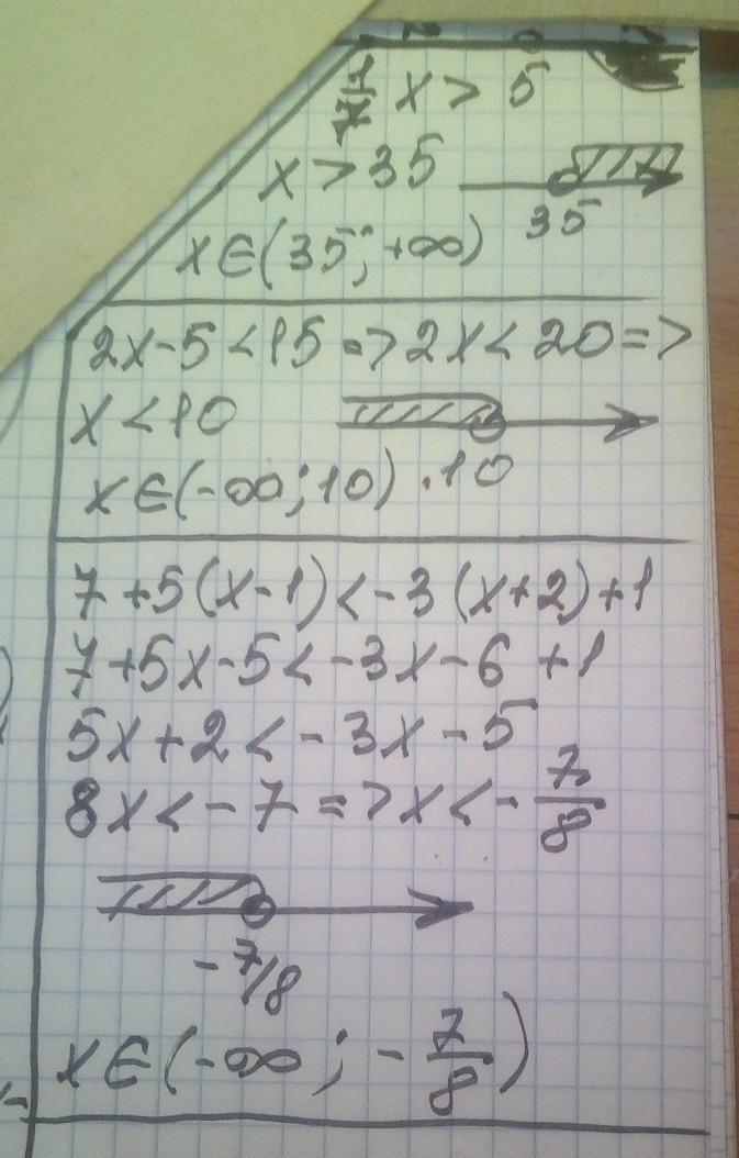 Решите неравенство 1/7x>5, 2x-5<15 , 7+5( x-1)<-3(x+2)+1