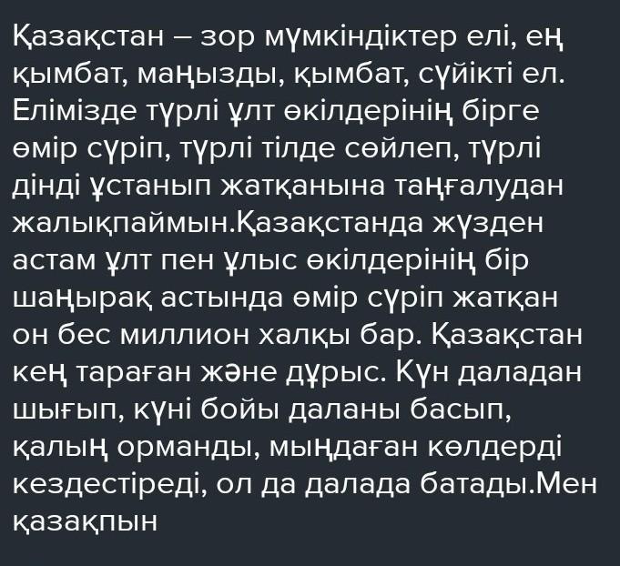 Казахстан-страна больших возможностей, самая дорогая, важная, дорогая, любимая страна. Не устаю удивляться, что в нашей стране люди разных национальностей живут вместе, говорят на разных языках, исповедуют разные религии.В Казахстане более ста национальностей и народностей живут под одним шаныраком. Казахстан широко распространен и прав. Солнце выходит из степи и весь день бродит по степи, встречая густые леса, тысячи озер, которые тоже закат в степи.Я казах