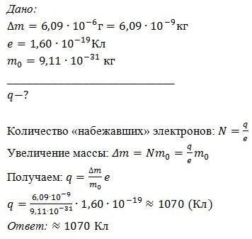 В результате электризации масса металлического шарика увеличилась на m=3,84*10^-6 г . Какой заряд приобрел шар? Масса одного электрона m0= 9,11* 10^-31 кг (Ответ округли до целого значения.)