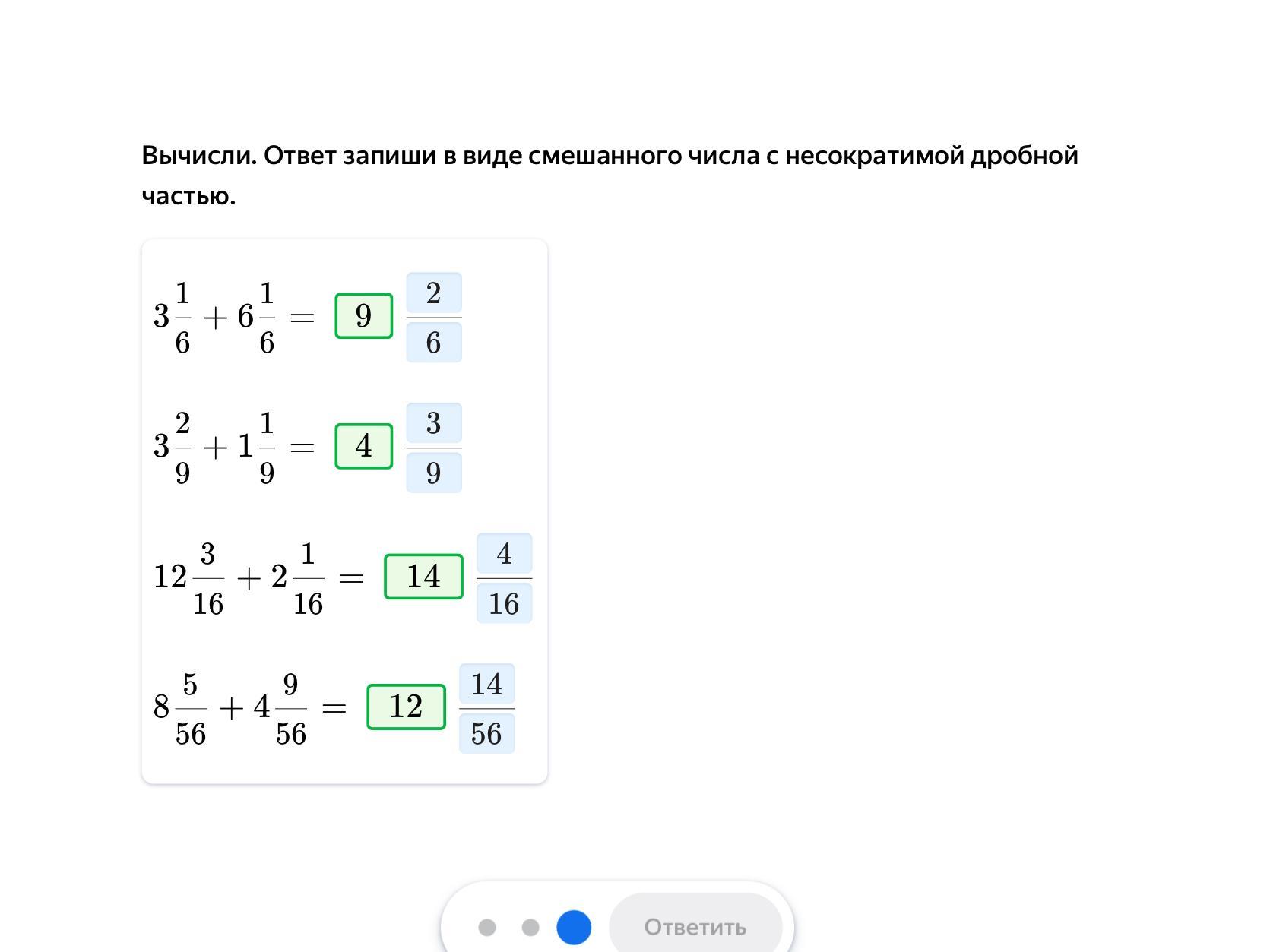 1 пример: сокращаем дробь, ответ 9 целых 1/3