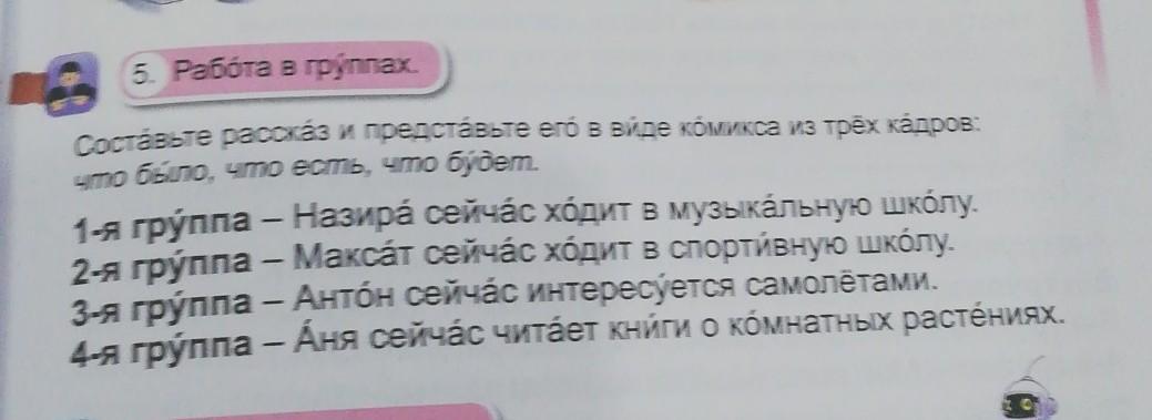 5. Работа в группах. Составьте рассказ и представьте его в виде комикса из трёх кадров: что было, что есть, что будет. 1-я группа – Назира сейчас ходит в музыкальную школу. 2-я группа — Максат сейчас ходит в спортивную школу. 3-я группа — Антон сейчас интересуется самолётами. 4-я группа – Аня сейчас читает книги о кӧмнатных растёниях. Помоги пожалуйста я не понела даю 5 балов