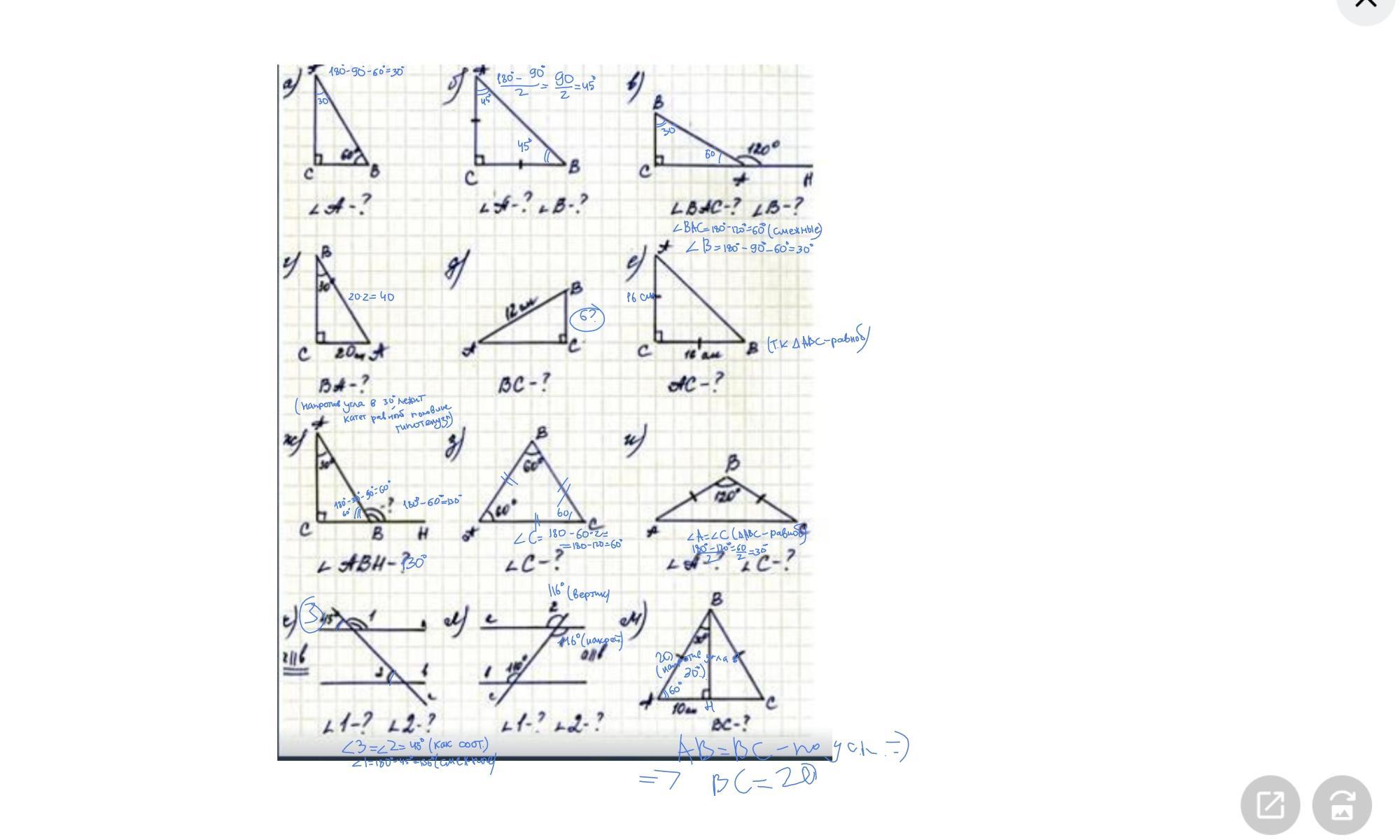 ж) угол В внутренней = 90 - 30 = 60