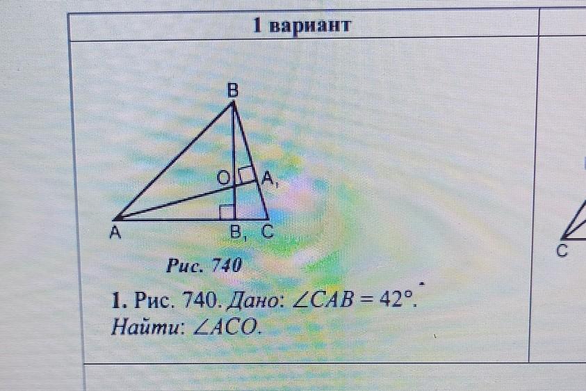 Все высоты в треугольнике пересекаются в одной точке, следовательно, если продлить СО, мы получим высоту СС1 с прямым углом АС1С. Получим прямоугольный треугольник АС1С, где известен угол ВАВ1=САВ=42 градуса. Тогда угол АСО=углу АСС1=90-42=48 градусов.