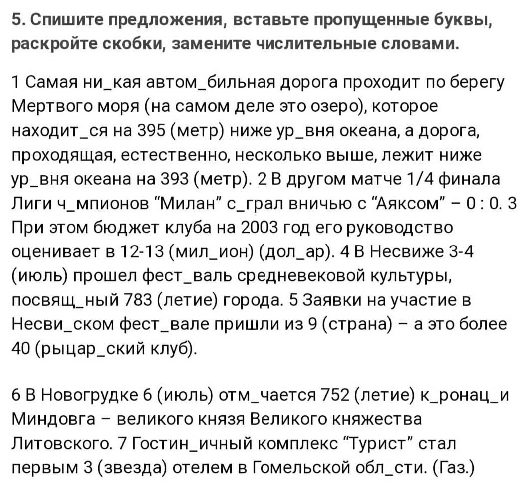 5. Спишите предложения, вставьте пропущенные буквы, раскройте скобки, замените числительные словами. 1 Самая ни_кая автом_бильная дорога проходит по берегу Мертвого моря (на самом деле это озеро), которое находится на 395 (метр) ниже ур_вня океана, а дорога, проходящая, естественно, несколько выше, лежит ниже ур_вня океана на 393 (метр). 2 В другом матче 1/4 финала Лиги Ч_мпионов “Милан” сграл вничью с “Аяксом” – 0:0. З При этом бюджет клуба на 2003 год его руководство оценивает в 12-13 (мил_ион) (дол_ap). 4В Несвиже 3-4 (июль) прошел фест_валь средневековой культуры, посвящ_ный 783 (летие) города. 5 Заявки на участие в Несви_ском фест_вале пришли из 9 (страна) — а это более 40 (рыцар_ский клуб). 6B Новогрудке б (июль) отм_чается 752 (летие) к_ронаци Миндовга – великого князя Великого княжества Литовского. 7 Гостиничный комплекс "Турист" стал первым 3 (звезда) отелем в Гомельской обл_сти. (Газ.)