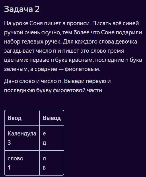 Дано слово и число n. Выведи первую и последнюю букву фиолетовой части.