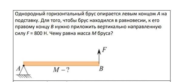Брус находится в равновесии при условии равенства нулю суммы моментов всех действующих на него сил. Согласно правилу рычага, записанному относительно точки A: Mg умножить на дробь: числитель: L, знаменатель: 2 конец дроби =F умножить на L. Отсюда M= дробь: числитель: 2F, знаменатель: g конец дроби =160кг.
