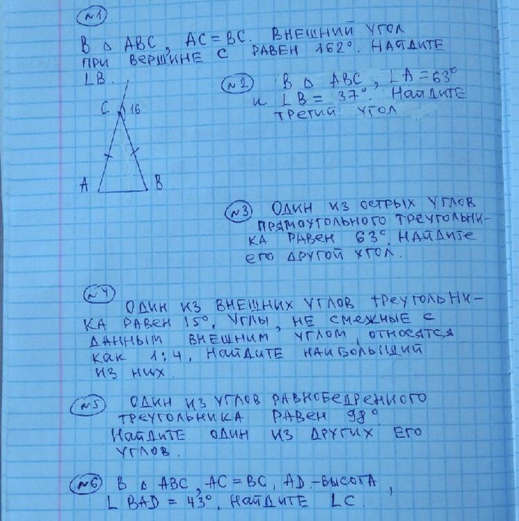 1) внешний угол при вершине смежный с углом acb, отсюда следует, угол acb= 180 -162 =18° угол b = (180-18)/2 = 162 /2 = 81 °