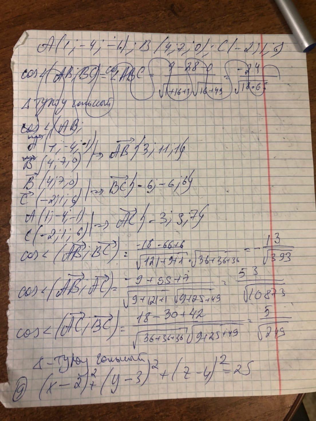 8. Найти косинуса угол в треугольнике АВС и определите вид этого треугольника, если А(1:-4;-1), B(4; 7; 0), C(-2; 1; 6).