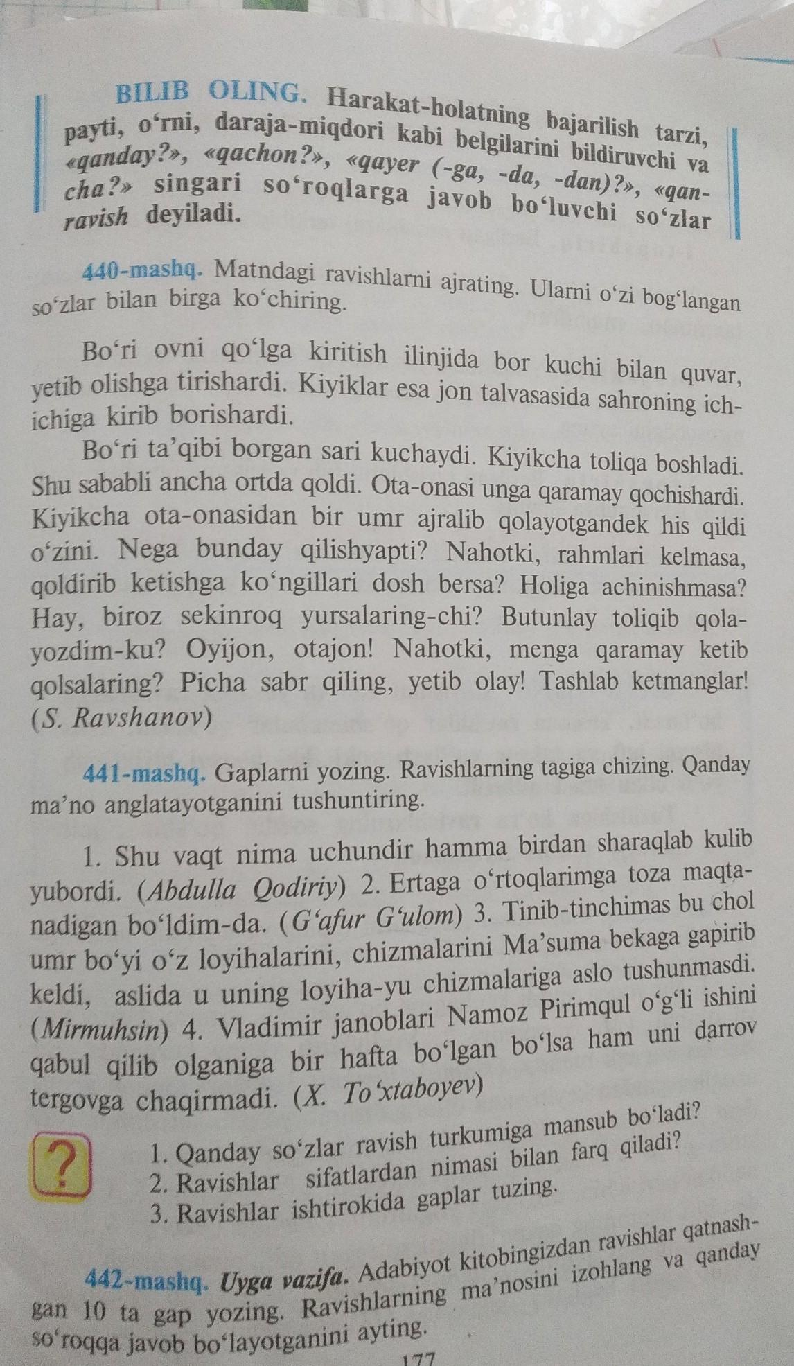ravishlar: birdan sharaqlab, ertaga, aslo, darrov
