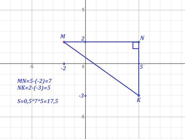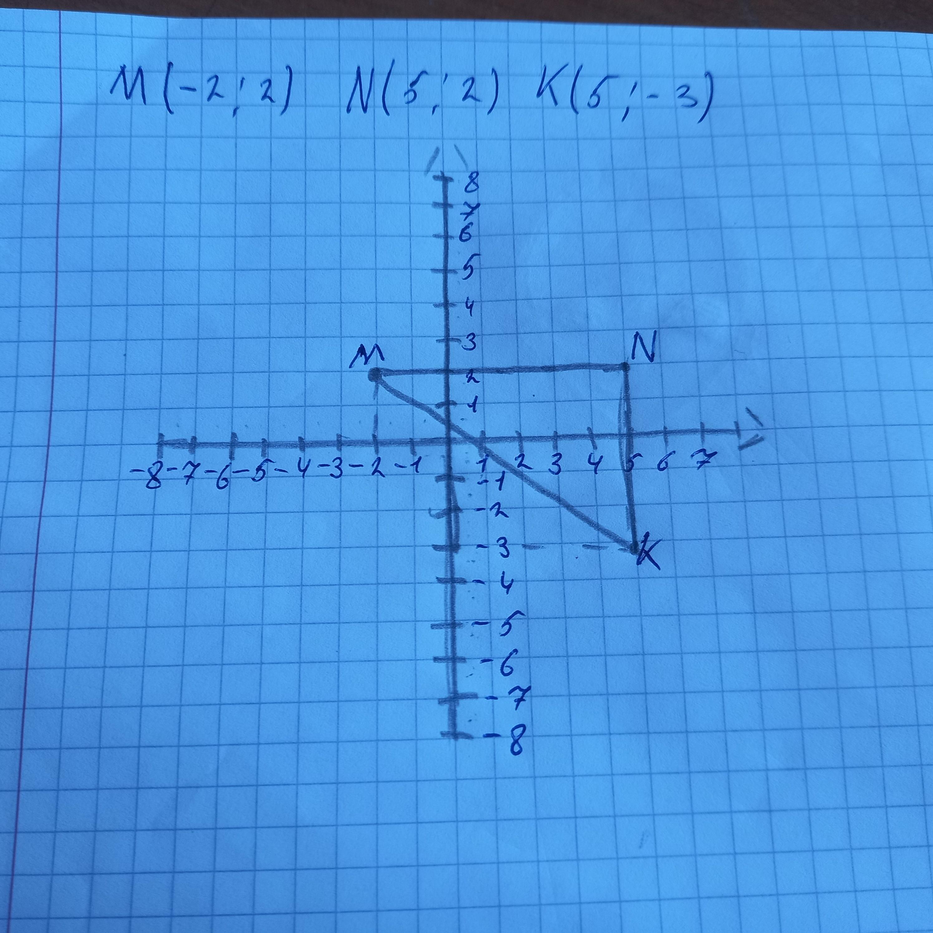 В координатной плоскости постройте треугольник MNK: M(-2; 2), (5; 2). К(5; -3).