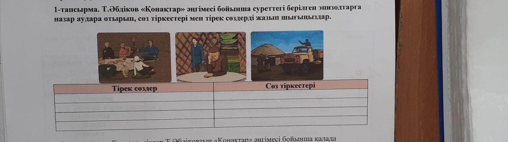 1-тапсырма. Т.Әбдіков «Қонақтар» әңгімесі бойынша суреттегі берілген эпизодтарға назар аудара отырып, сөз тіркестері мен тірек сөздерді жазып шығыңыздар.
