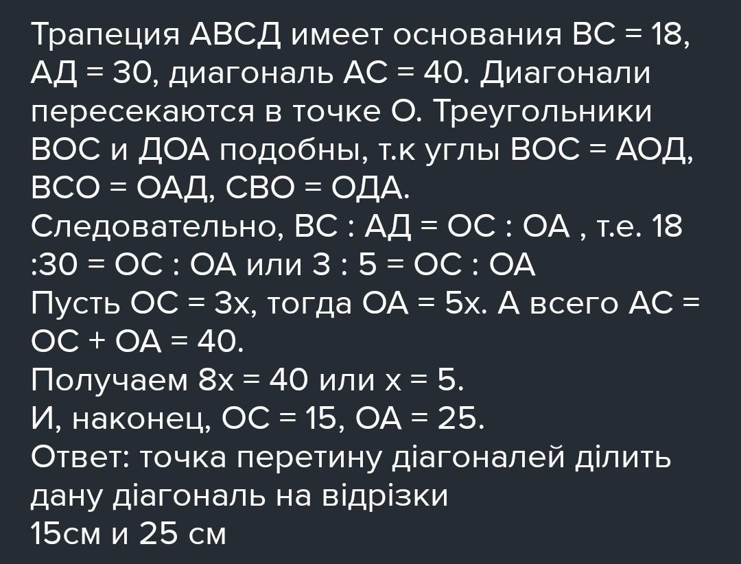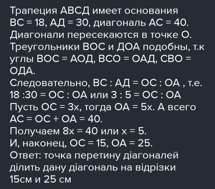 Одна з діагоналей трапеції та її основи дорівнюють 40 см, 18 см і 30 см. Знайдіть відрізки, на які точка перетину діагоналей ділить дану діагональ. У відповідь запишіть довжину меншого відрізка (у см)