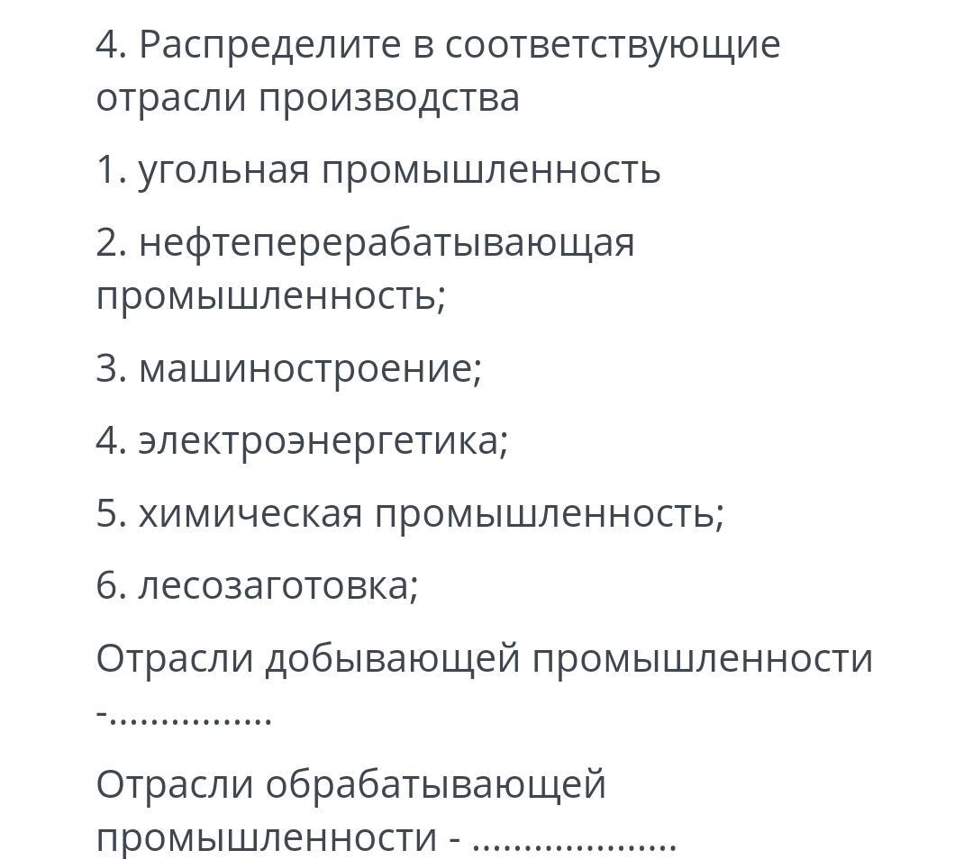 1.Добывающая промышленность – это комплекс отраслей по добыче и первичной переработке полезных ископаемых. Основные группы: топливная, рудодобывающая, промышленность нерудных полезных ископаемых, горно-химическая. Топливная - совокупность отраслей промышленности, занятых добычей и переработкой различных видов топлива .
