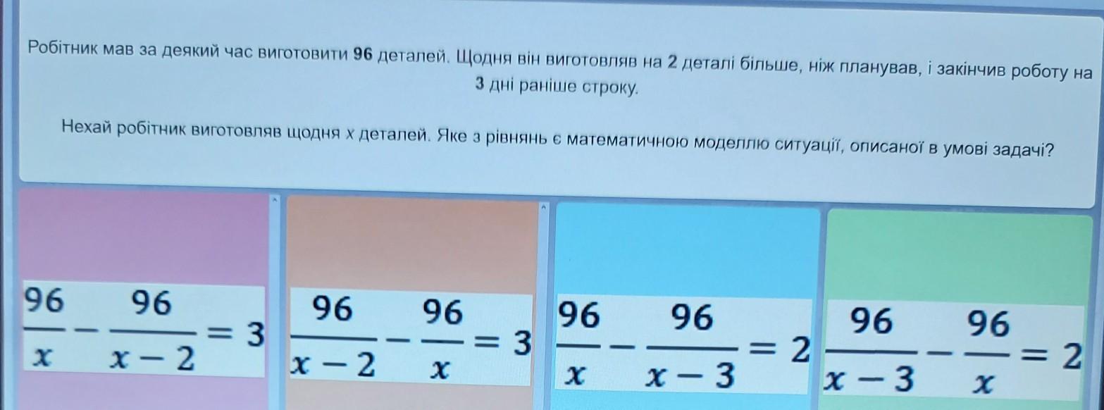 Робітник мав за деякий час виготовити 96 деталей. Щодня він виготовляв на 2 щеталі більше,ніж планував,і закінчив роботу на 3 дні раніше строку. Нехай робітник виготовляв х деталей. Яке з рівнянь є математичною моделлю ситуації,описаної в умові задачі?