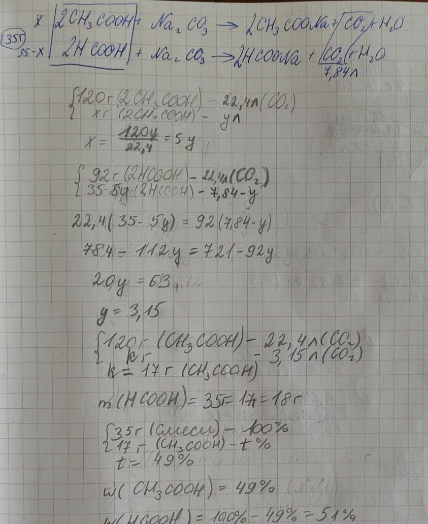 результаті взаємодії 35 г суміші мурашиної та оцтової кислот із достатньою кількістю натрій карбонату виділилося 7,84 л газу (н. у.). Визначте масові частки кислоту суміші.