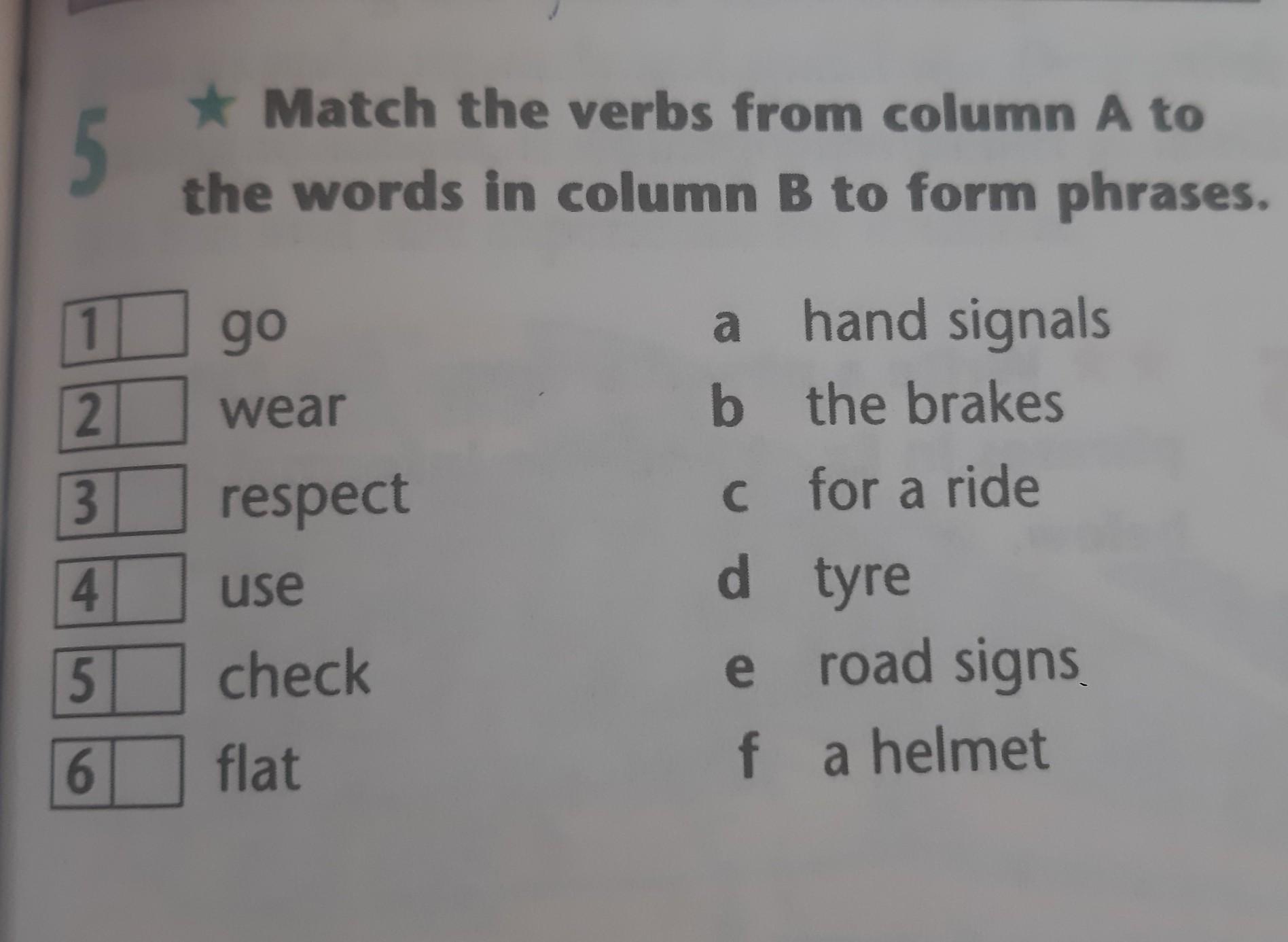 Match the verbs from column A to the words in column B to form phrases. 1 go 2 wear 3 respect a hand signals b the brakes c for a ride d tyre e road signs f a helmet use 5 check e 6 flat