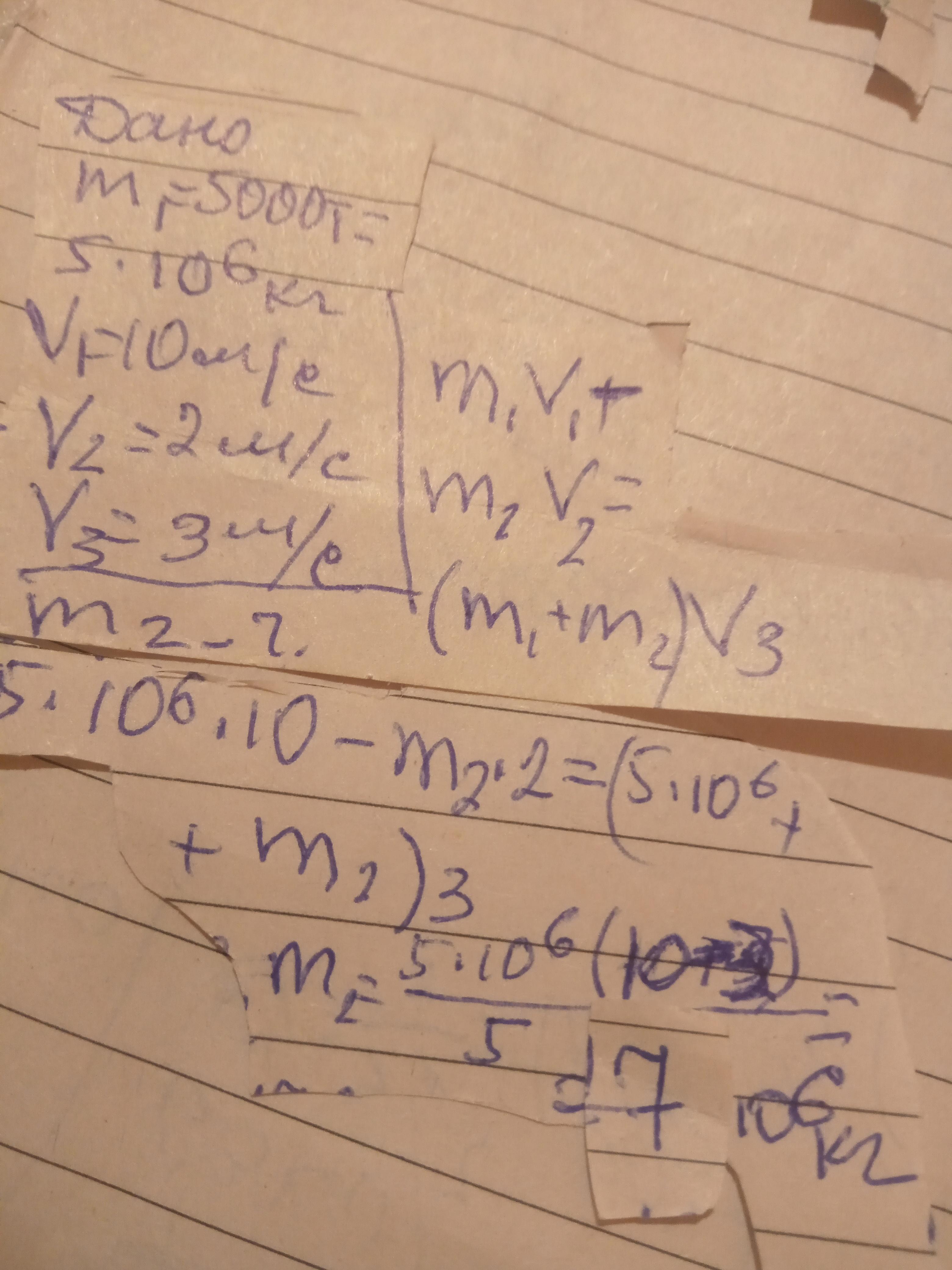 Криголам масою 5000 т., що рухається з вимкненим двигуном зі швидкістю 10 м/с, наштовхується на крижину і продовжу рухатися зі швидкістю 2м/с, штовхаючи крижину перед собою. яку масу мала крижина, якщо до зіткнення вона рухалася назустріч криголаму зі швидкістю 3м/с