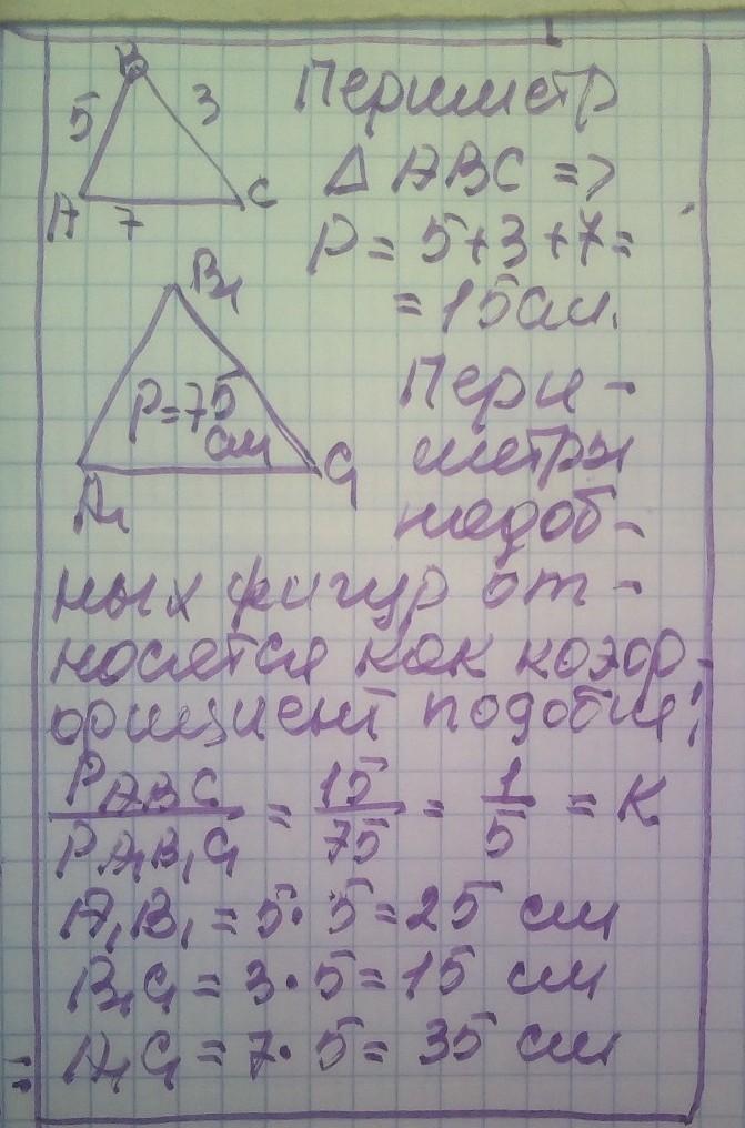Сторони трикутника дорівнюють 3см 5см і 7см. Знайдіть сторони подібного трикутника периметр якого дорівнює 75 см