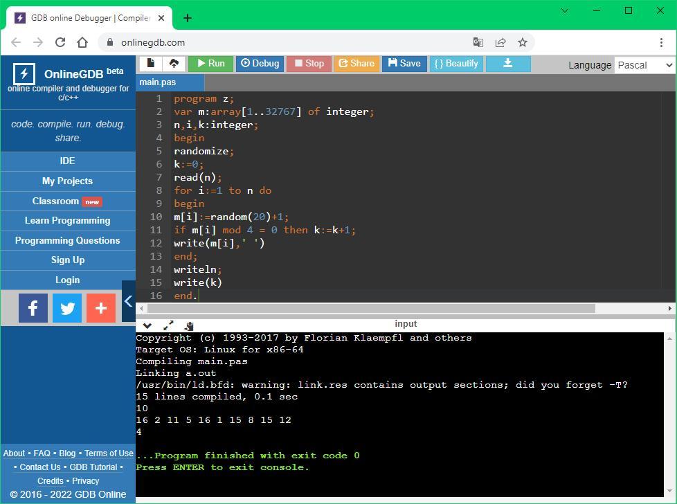 в программе используем циклс параметром (for i:=1 to n do) и условный оператор (if m[i] mod 4 = 0 then k:=k+1;)