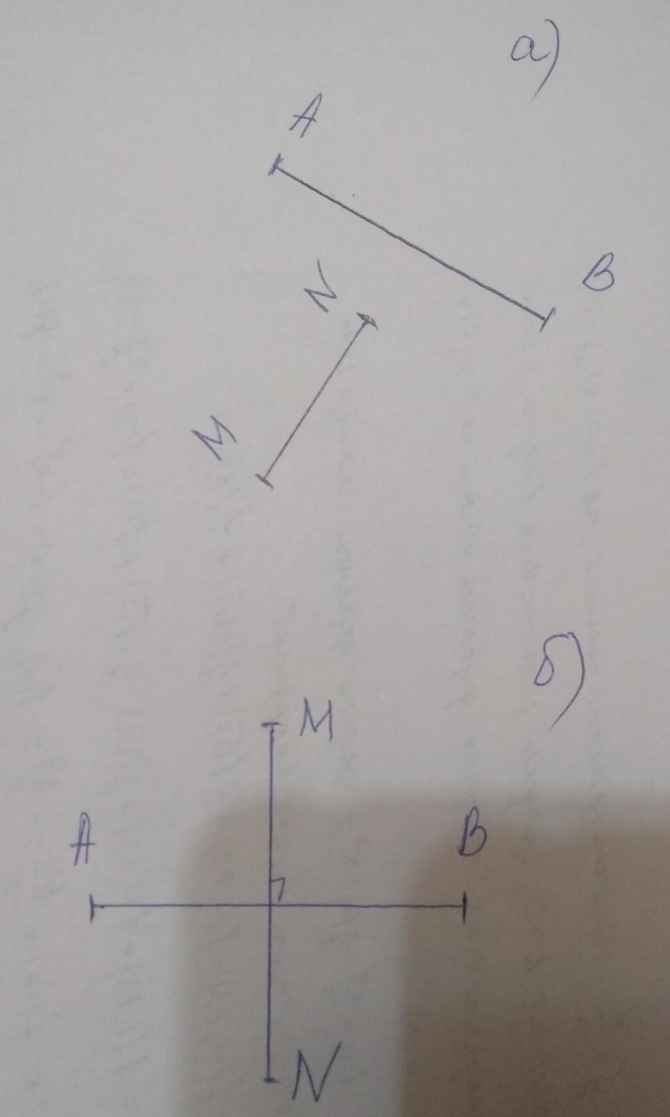 477. Начертите два перпендикулярных отрезка - AB и MN – так, чтобы они: а) не пересекались; б) пересекались.
