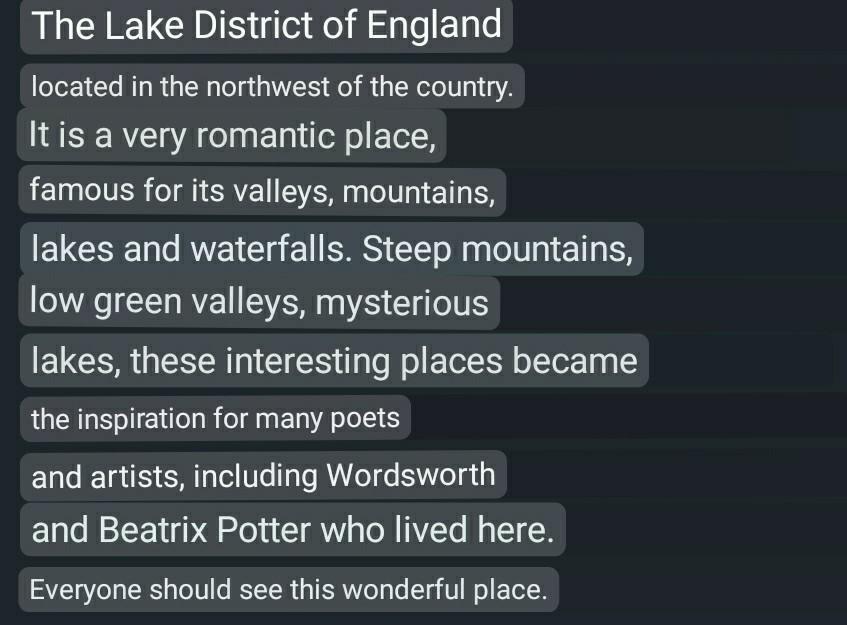Озерный край (the Lake District) Англии расположен на северо-западе страны. Это очень романтическое место, известное своими долинами, горами, озерами и водопадами. Крутые горы, низкие зелёные долины, загадочные озёра эти интересные места стали вдохновением для многих поэтов и художников, включая живших здесь Вордсворта и Беатрис Поттер . Каждый должен увидеть это прекрасное место.