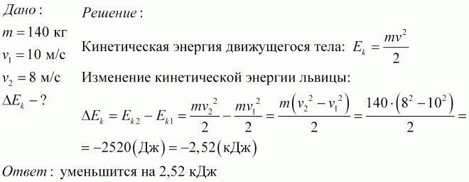 Как изменяется кинетическая энергия львицы массой 128 кг во время охоты, если она снизит скорость бега с 9 м/с до 6 м/с.