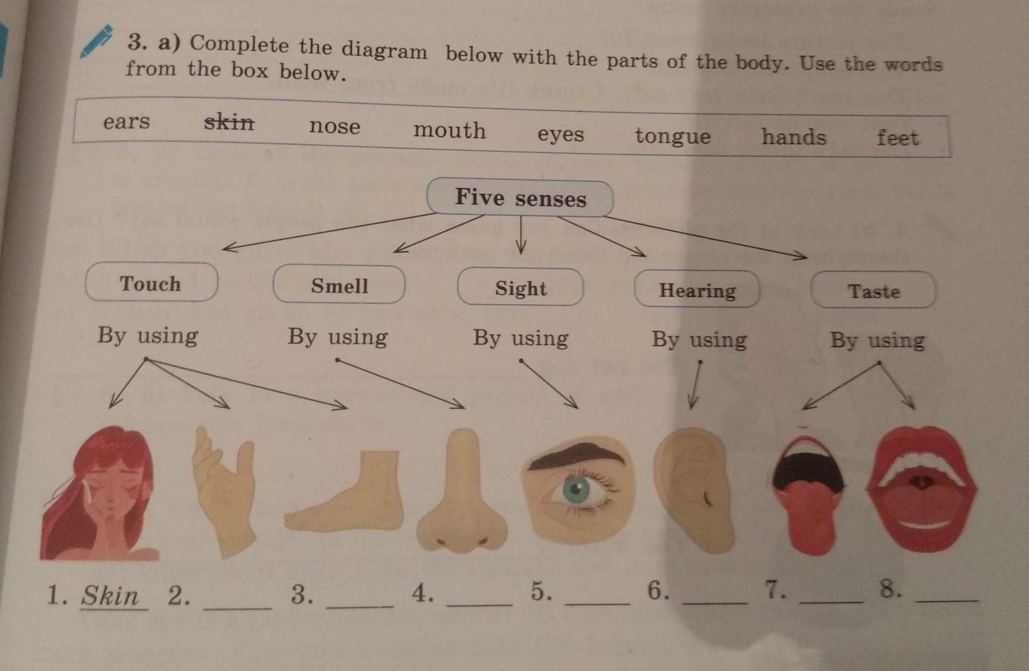 3. a) Complete the diagram below with the parts of the body. Use the words from the box below. skin nose mouth ears eyes tongue hands feet