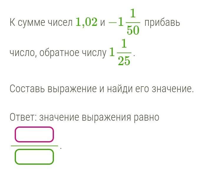 1,02 + ( - 1 1/50)+25/26 = 25/26 - значение выражения