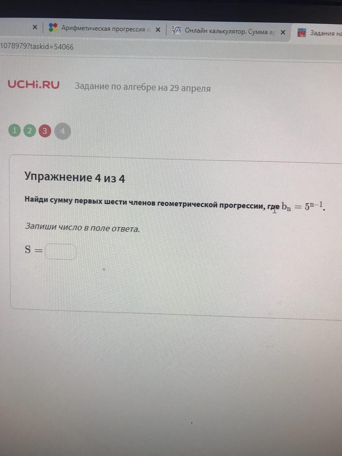 для шести членов S₆=b₁*(q⁶-1)/(q-1)=1*(5⁶-1)(5-1)=15624/4=3906;