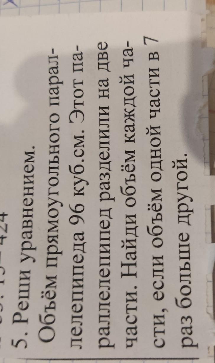 5. Реши уравнением. Объём прямоугольного парал- лелепипеда 96 куб.см. Этот па- раллелепипед разделили на две части. Найди объём каждой ча- сти, если объём одной части в 7 раз больше другой. НАДО УРАВНЕНИЕМ!!!!