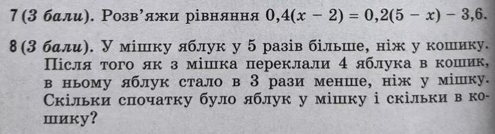Нехай в кошику х яблук, то у мішку 5х яблук. Маємо рівняння: (5х-4)=(х+4)*3