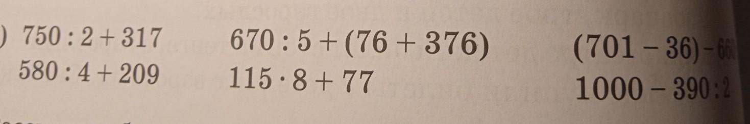 (701 - 36) - 660 670:5+ (76 +376) 115.8+77 6) 750:2 + 317 580:4 + 209 1000 - 390 : 2