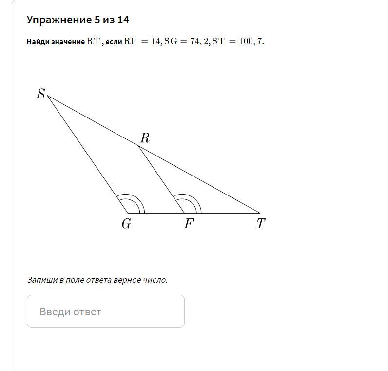 Т. к. ∠G=∠F, то SG║RF. Следовательно ΔSGT и ΔRFT подобны. А в подобных треугольниках сответственные стороны пропорциональны. Т.е. SG/RF=ST/RT ⇒RT=RF*ST/SG=14*100,7/74,2=