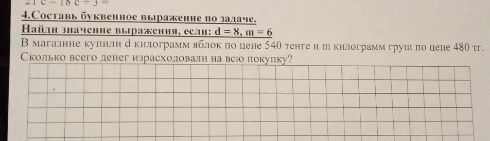 4.Составь буквенное выражение по задаче. Найди значение выражения, если: d = 8, m = 6 В магазине купили d килограмм яблок по цене 540 тенге и m килограмм груш по цене 480 т Сколько всего денег израсходовали на всю покупку?