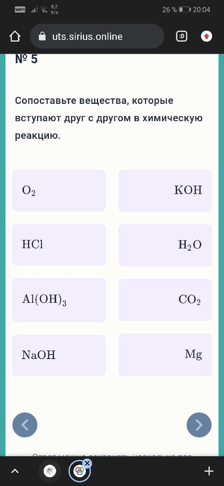 у тебя что-то не понятное вот норм ответ нашел:                              O2=Mg                                                                                                                      HCI=KOH                                                                                                                                                                                             HCI=Mg                                                                                                                                  NaOH=CO2